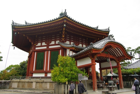 猿沢の池から石段をのぼった場所に位置する南円堂。この石段の途中を左に折れると、国宝の三重塔があるのでいっしょに見たいものである。八角の円堂であり、正面に大きな唐破風がついている。とても大きな規模の魅力的な建物であった。