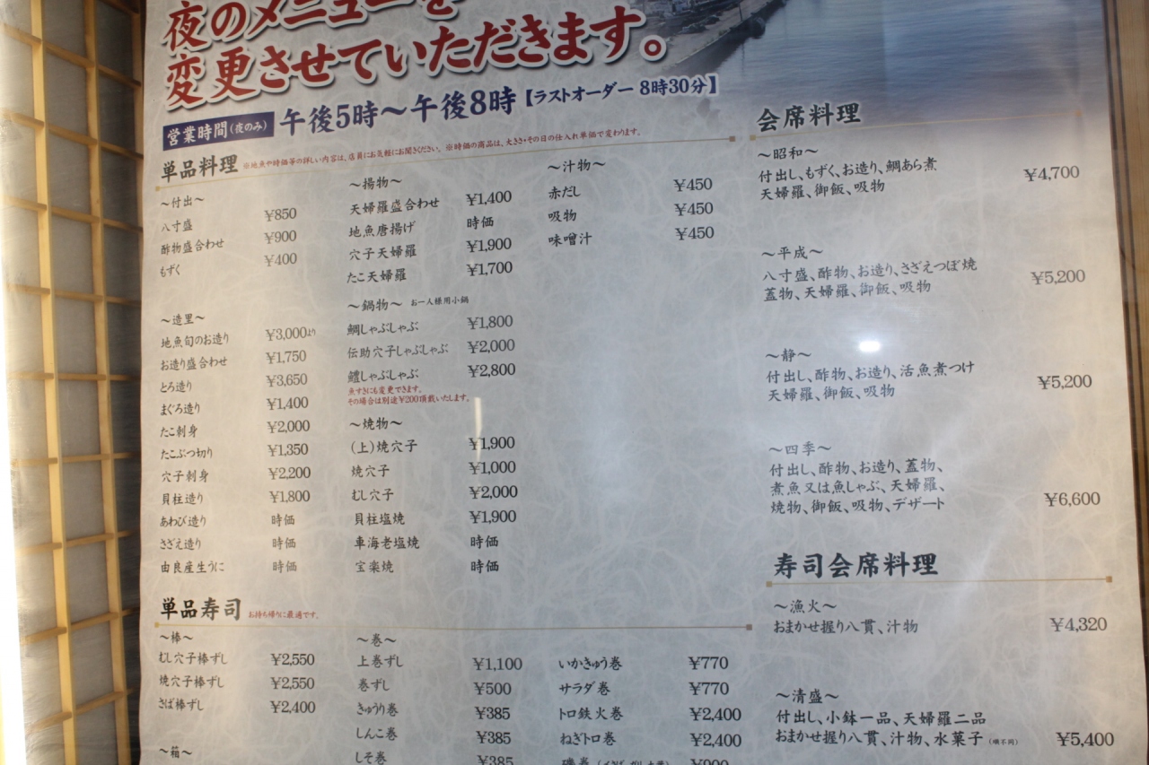 同じ名前のステーキハウスがこの近くにある。姉妹店かもしれませんね。こちらは純然たる海鮮和食。ランチはやってないみたいだ。夕食は午後5時からラストオーダーは20:30という早さ。メニューを見るとやや高め?明石の新鮮な魚介を楽しめるのは確か。シラス丼など如何?