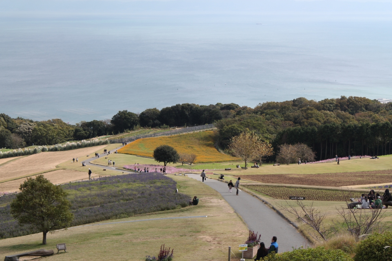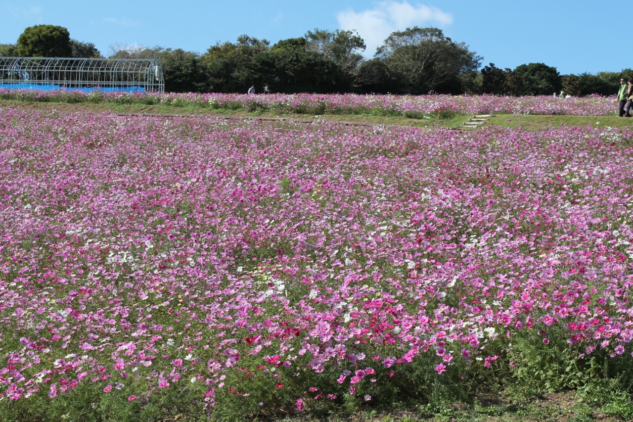一年振りで会わじ花さじきに行ってみた。去年も11月のコスモスの季節だったけれど、ちょっと時期が遅かった。今回はちょうど満開の時期。ここの丘はいつも風が強い。今日も近くの風力発電のプロペラは勢いよく廻っていた。昨年の火災でベランダへの立ち入りは禁止になっていたけれどこれも回復。暖かな日差しはお弁当を広げる家族ずれも。