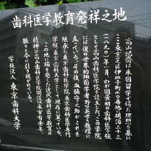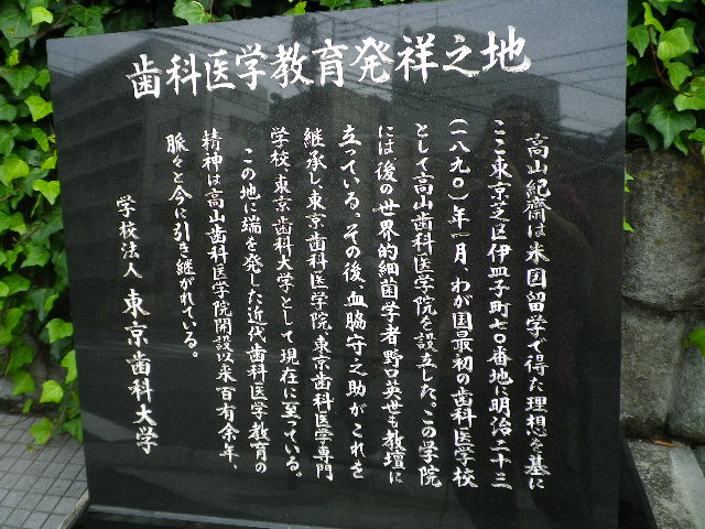 泉岳寺駅から徒歩5分ほどの伊皿子坂の交差点脇にありました。比較的新しい碑のようです。ここに東京歯科大学の前身の歯科医学院があったそうです。この場所はひょっとして日本中の歯医者さんの聖地なのでしょうか。