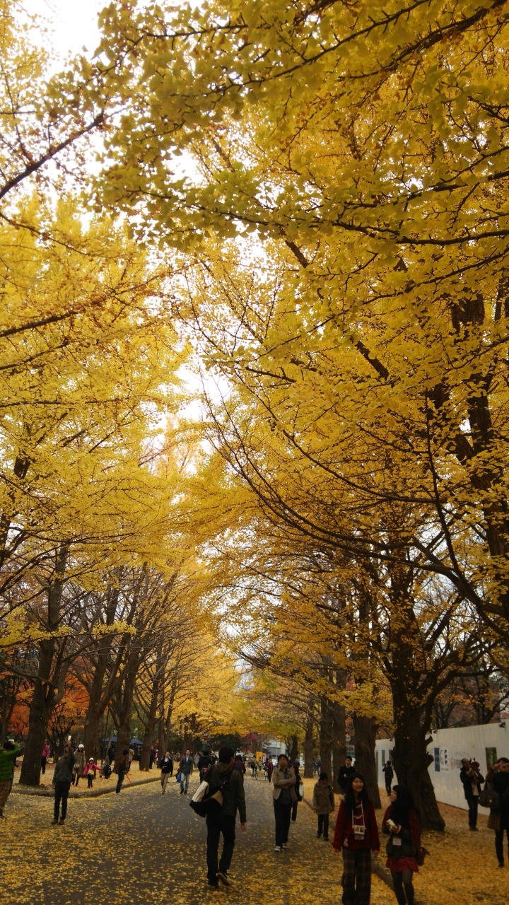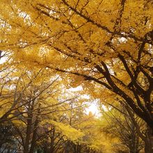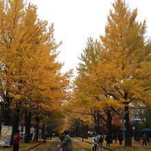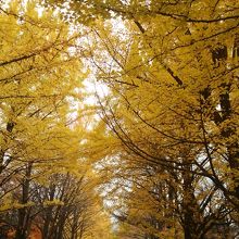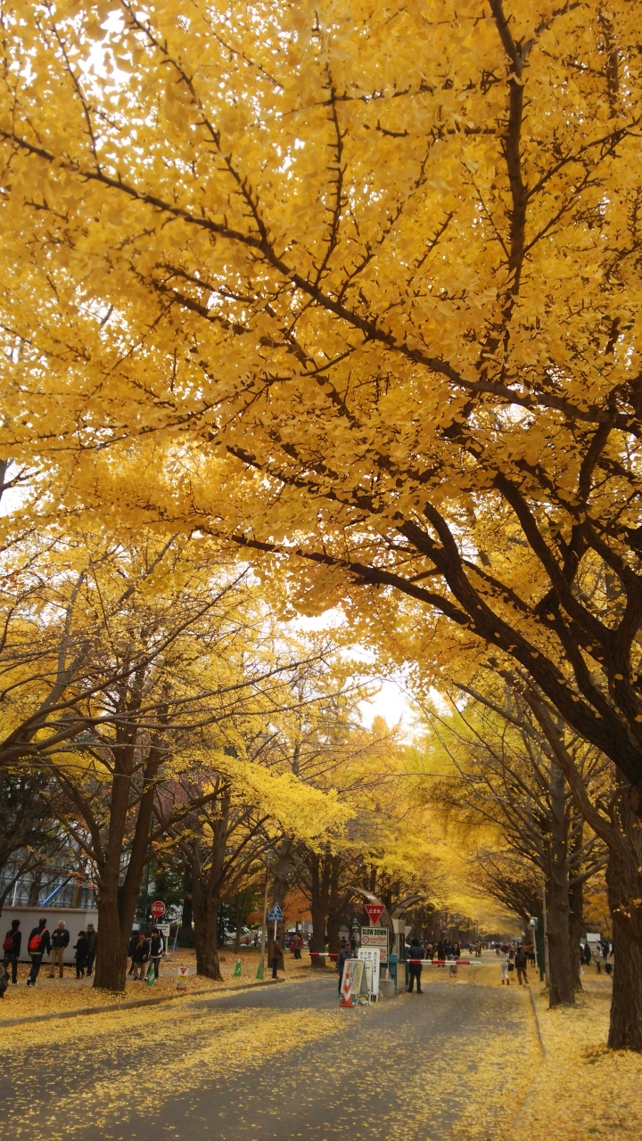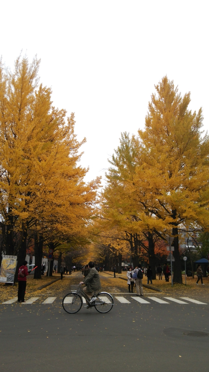 広大な北海道大学のキャンパス内にあります。13条門から車道の両側に見上げるほどのイチョウ並木が続きます。歩道はいちめん黄色の落葉です。風が吹くとはらはらと葉が落ち、きれいでした。ギンナンを拾っている方もいました。