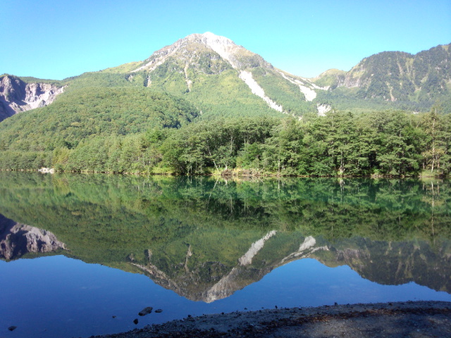 天気が良くて風が無い日は、湖面に焼岳や穂高連峰の景色がきれいに映りこみます。なかなか見れない景色なので、見れた時には言葉の出ないぐらいの美しさです。私も何度か大正池に行っていますが、今回は久しぶりの絶景でした。