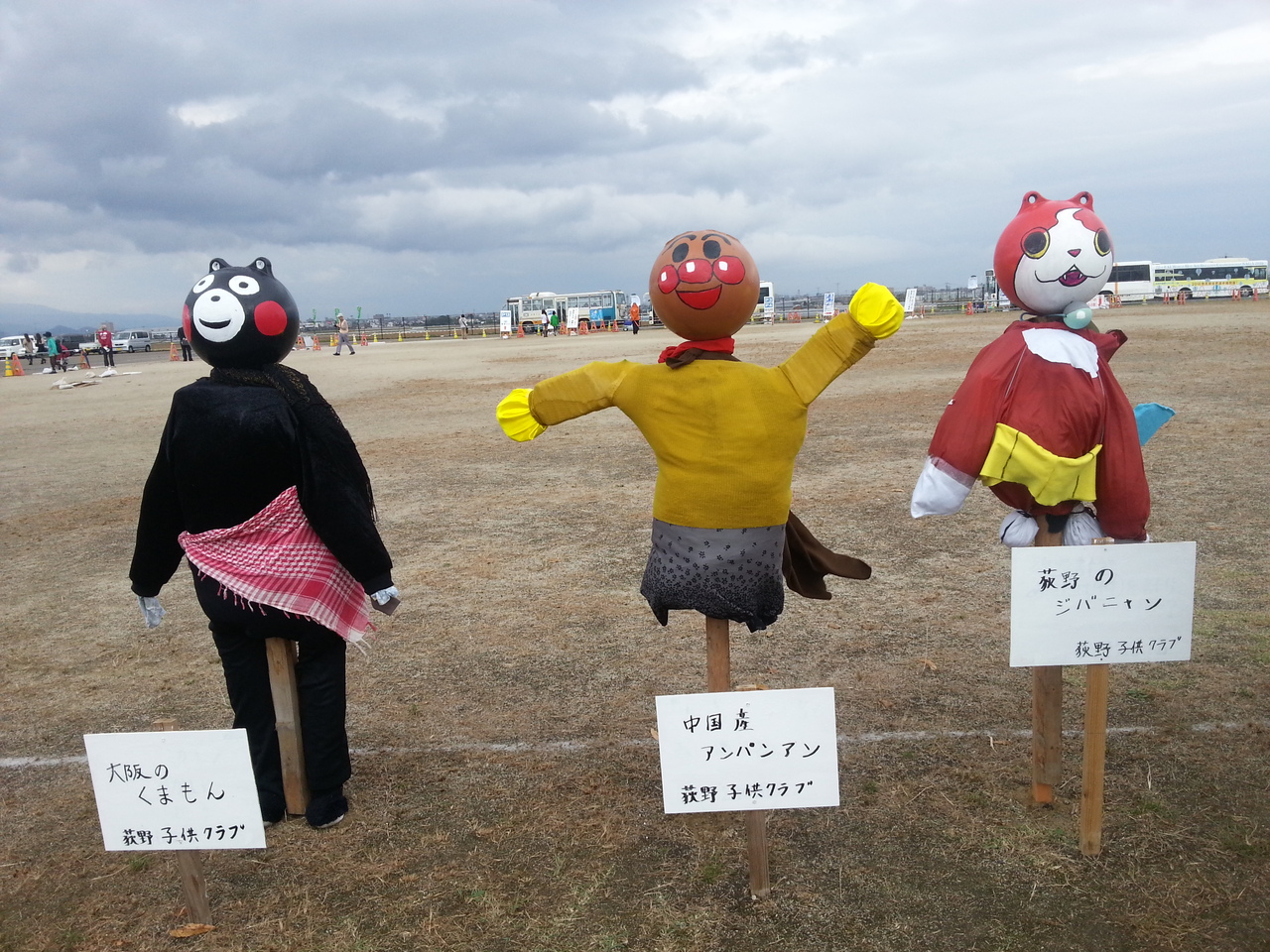 お昼から行ったら、ちょうど雨が降ってきて午後の競技が中止でした(泣)物産店や出店をブラブラし、子どもが大好きなアナ雪のクジをしました。夜間係留は強風のため球皮なしのバーナーのみで行われました。せっかく行ったけど、バルーンを見れず終いで残念です(T-T)会場の横では、かかしまつりが開催されていました。