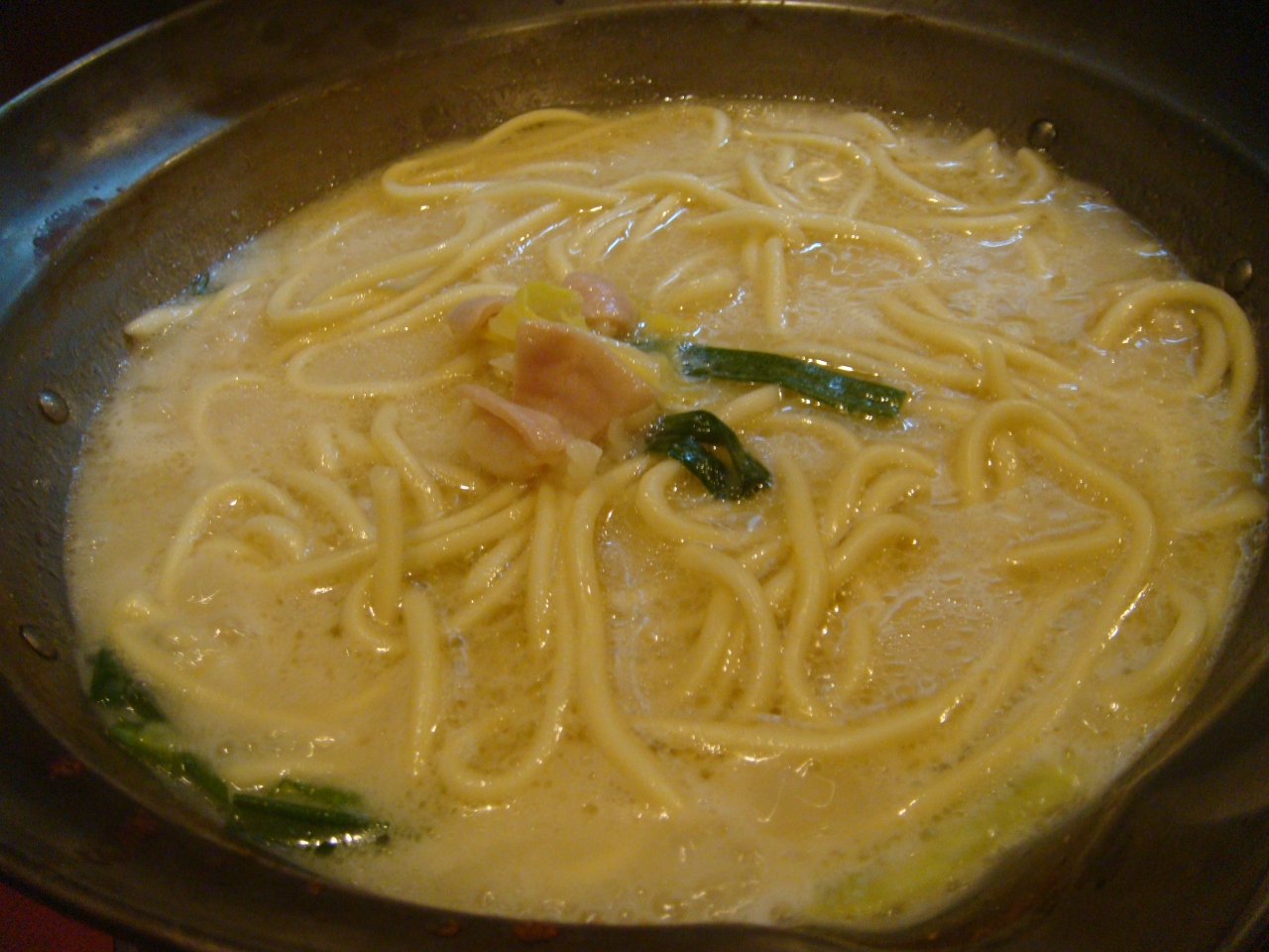 もつ鍋が煮えてきました、たっぷりのニラとキャベツ。