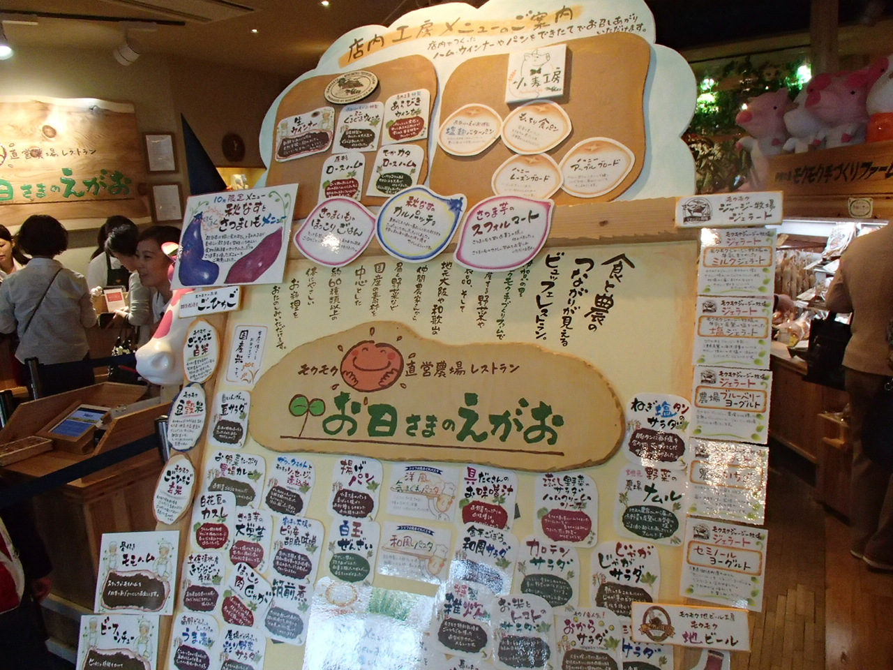 お日さまのえがおは、食と農業とのつながりがよく見えるビュッフェスタイルのレストランで、ねぎ塩タンサラダや具たくさんのお味噌汁等があります。デザートには、白玉ぜんざいがいいです。ぜひ、一度、食べに行ってみてください