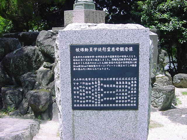 平和記念公園の向かい側。川沿いの目立たないところに建っているのがこの像です。動員学徒を悼んだもので、慈母観音が平和記念公園の方を向いています。案内もないので見つけるのに苦労しましたが、有名ではない慰霊碑を回るのも広島観光の意義深いところだと思います。