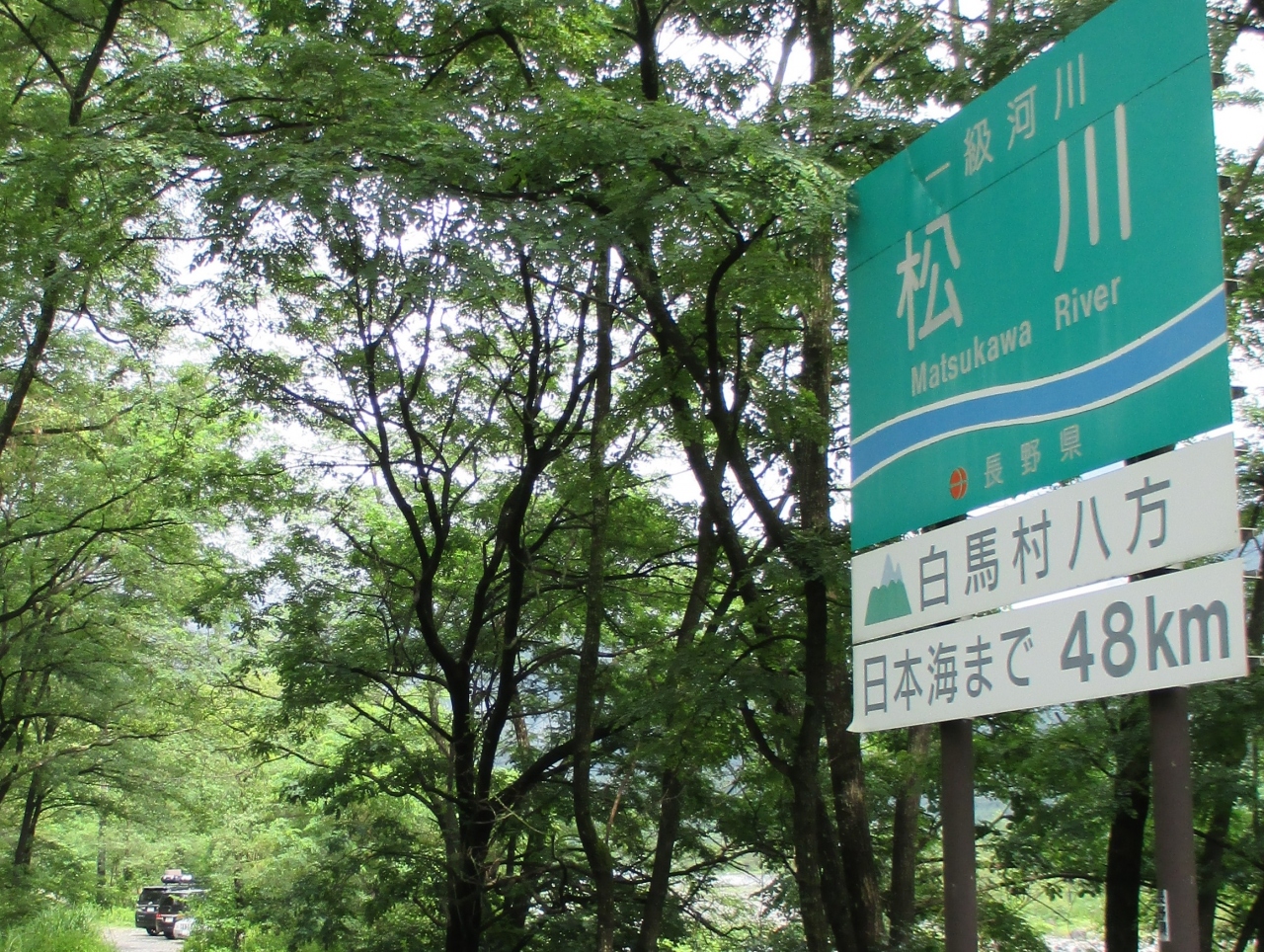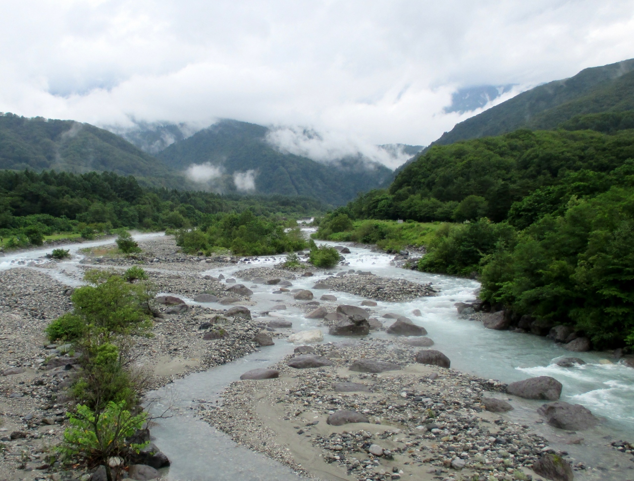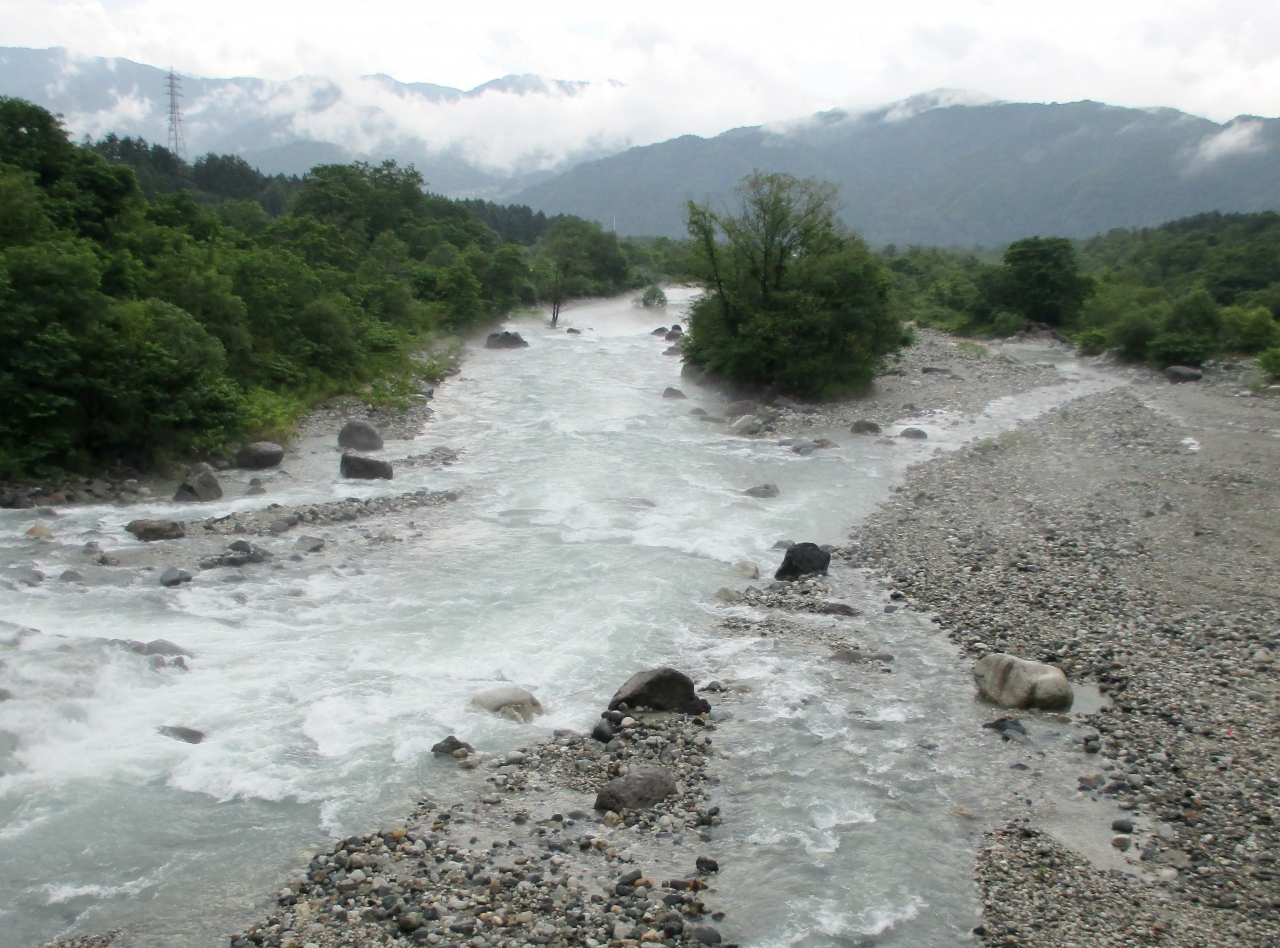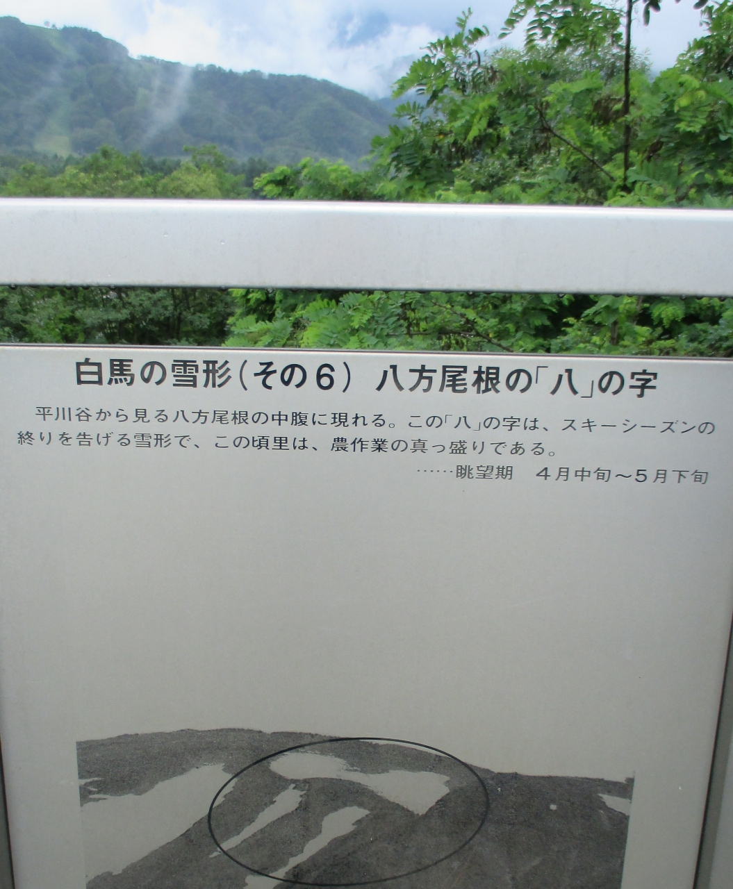 橋には白馬三山の案内看板がありましたが、この日は生憎の雨で、