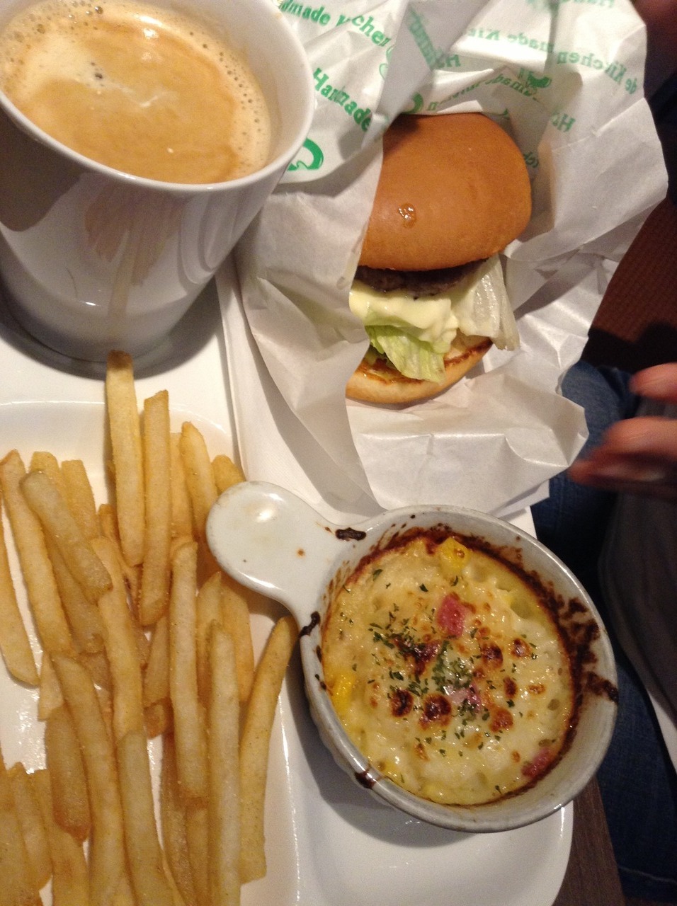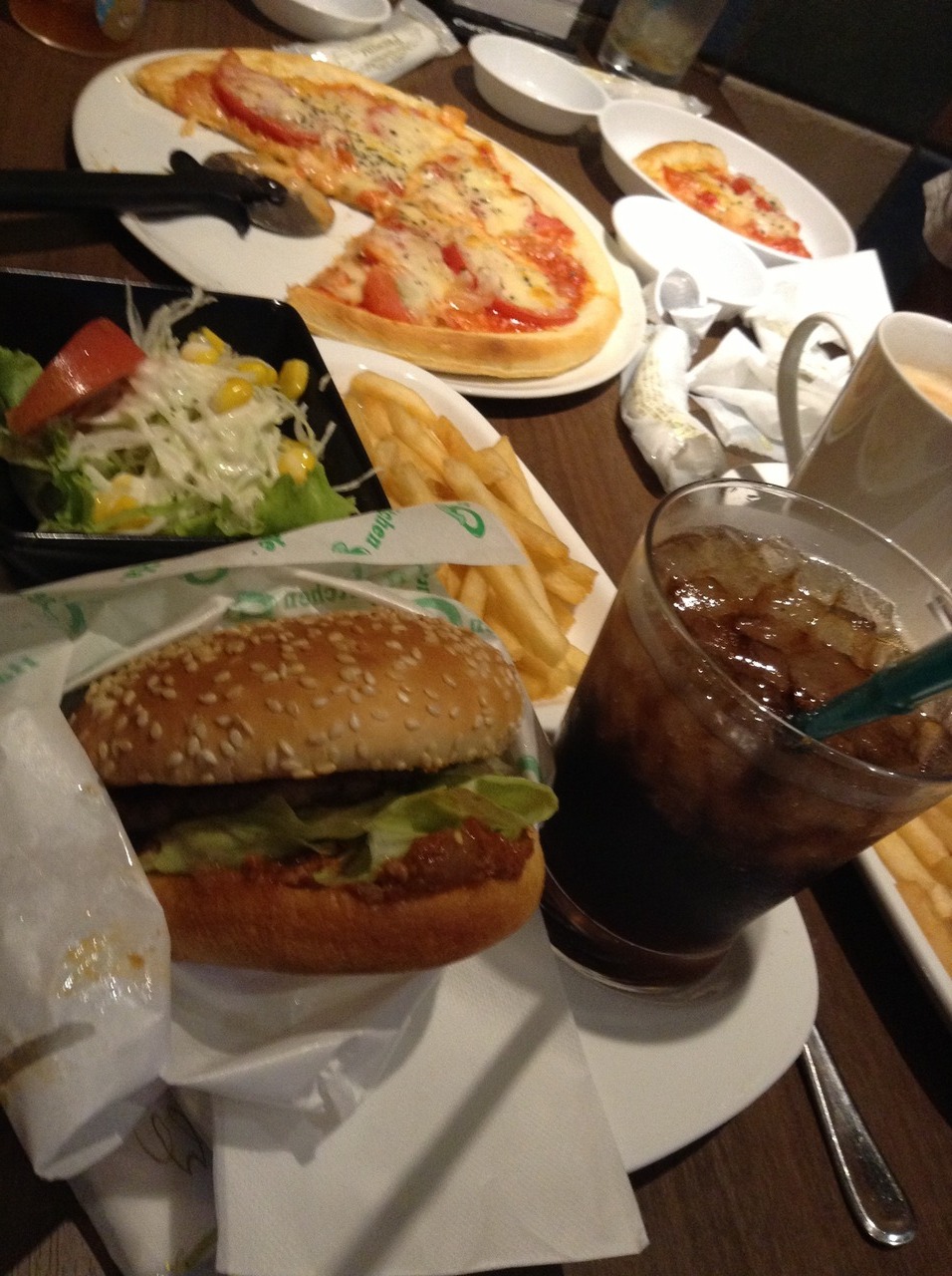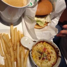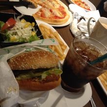 ミートソースを挟んだOJバーガーにプラス300円で、グラタンorサラダ、ポテト、ドリンクが付いたセットを注文しました。