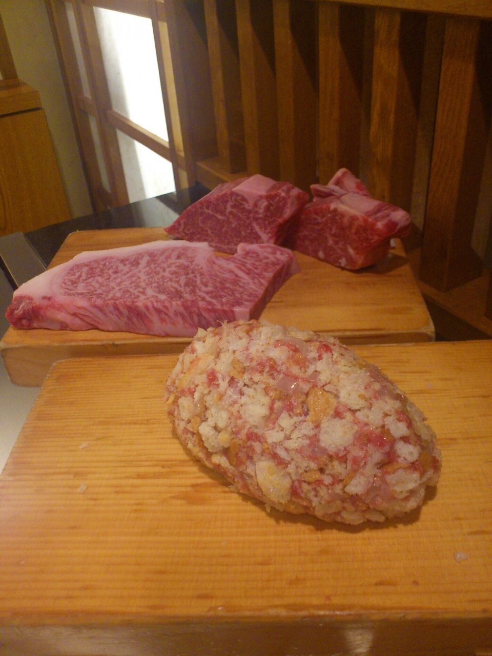 お肉屋さんの肉汁たっぷりのハンバーグが好きなのですが、こちらのハンバーグは粗切りの玉ねぎとパン粉が多く、柔らかいのですがお肉の感じがもう少し欲しいなーと思いました。コースのお肉は、さすがお肉屋さん。柔らかいの神戸牛をベストな焼き具合のミディアムレアで美味しくいただきました。