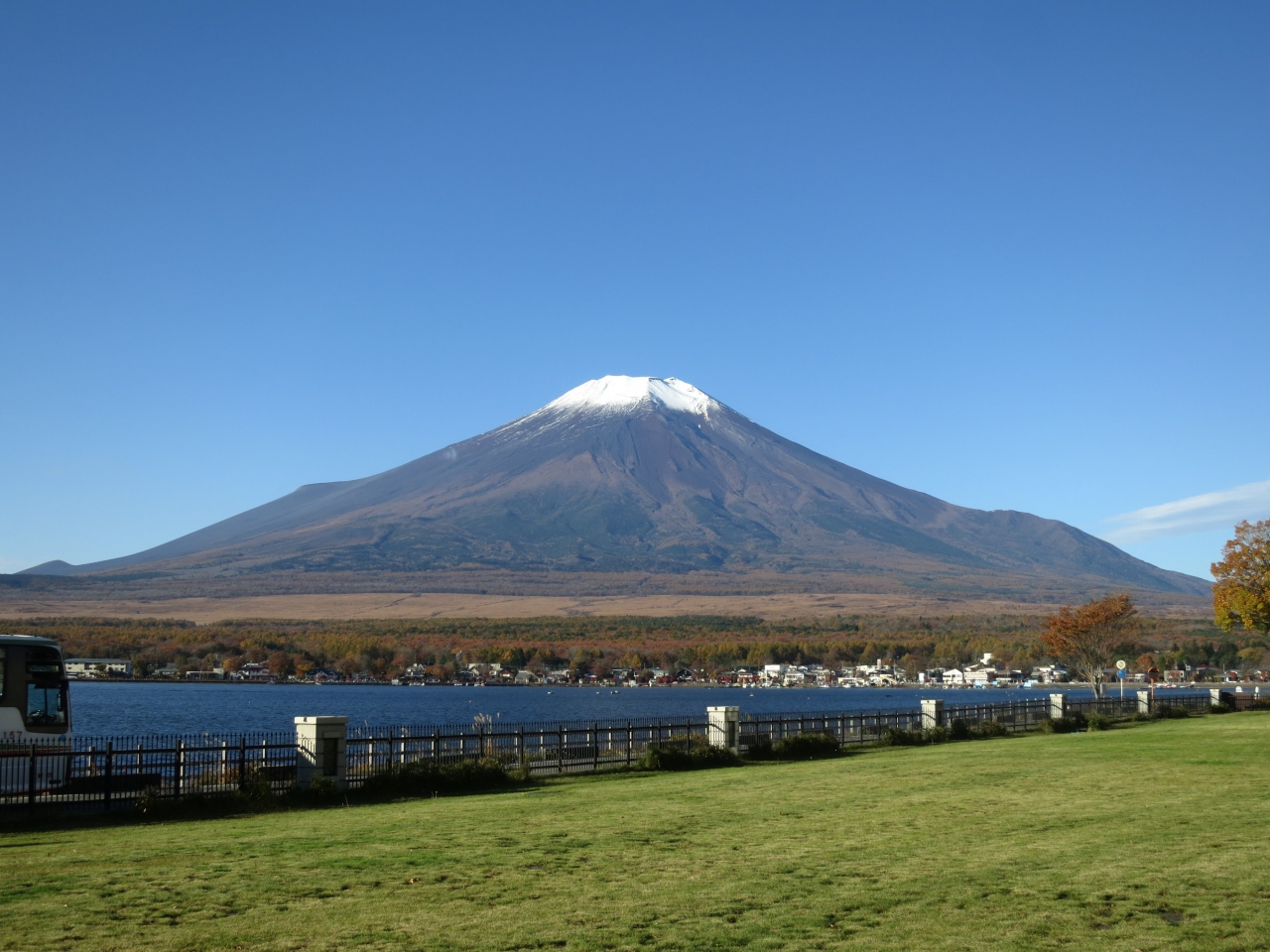 いろいろなところから見える富士山、そしてよく見えたらなんだかうれしい富士山ですが、やっぱり山中湖や河口湖まで来たら、雄大な富士山を裾野まで見たいと思います。紅葉の時期に山中湖のホテルに泊まりに行った際、朝日丘湖畔緑地公園で開催中の「山中湖夕焼けの渚紅葉まつり」に行きました。あいにくの曇り空で、この日は富士山はきれいに見えませんでしたが、山中湖を目の前に、約600mの美しい紅葉回廊を散歩し、紅葉狩りを楽しみました。晴れていたら夕暮れにライトアップされたもみじと、夕焼けの富士山の両方が楽しめる絶景スポットです。またこの時期(10月中旬から2月下旬)、ダイヤモンド富士もここで見られるようです。翌日は晴天で、宿泊した山中湖畔のホテルのお部屋からも露天風呂からもレストランからも雄大な富士山と穏やかな山中湖が見え、最高でした。山頂は雪に覆われ、麓は紅葉した富士山も大変きれいでした。