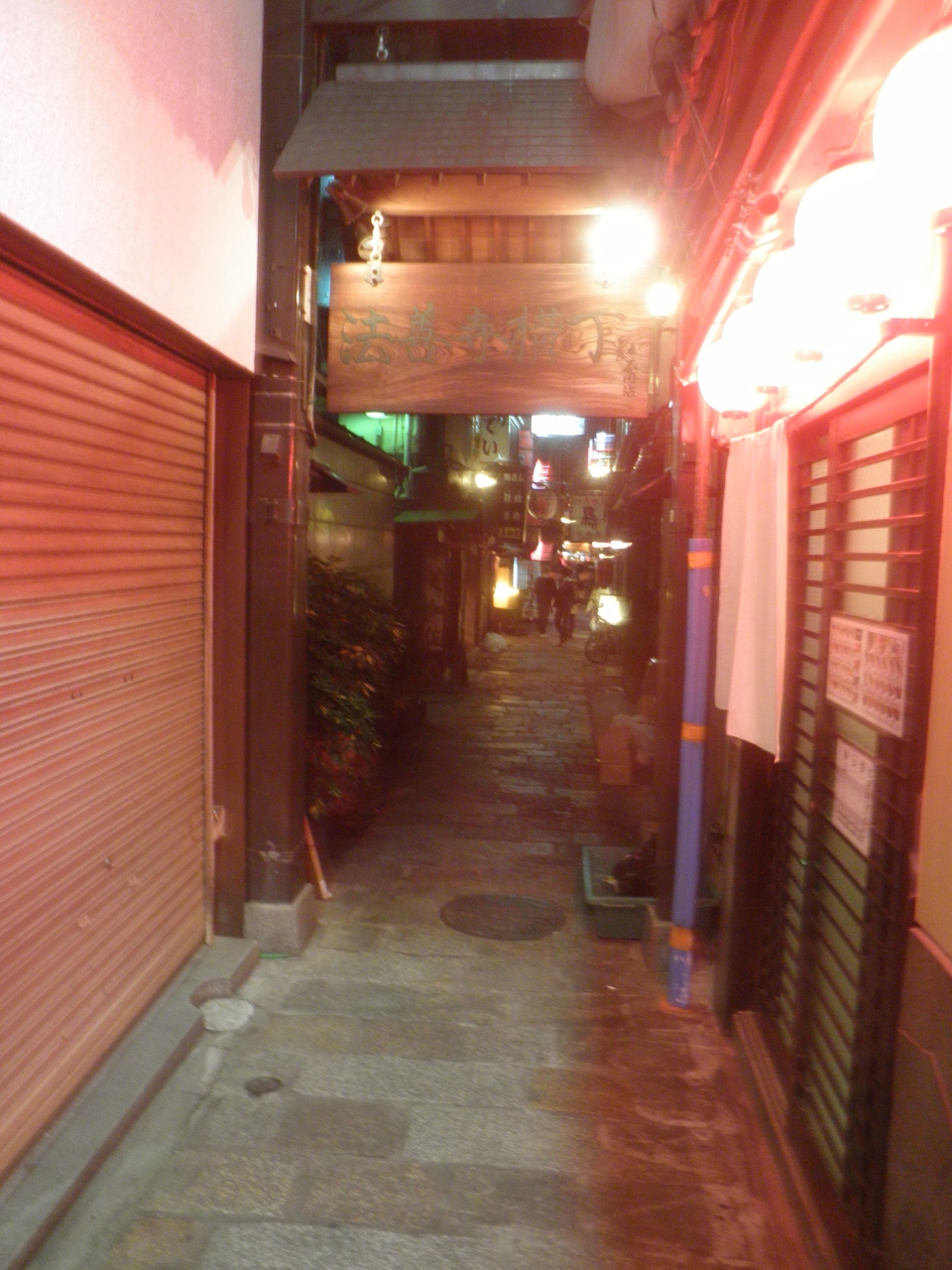 大阪道頓堀の戎橋の周囲は、通行人が多いし漫画チックな立体看板や客引きがおおいけど、すぐそばの法善寺横丁は、薄暗くて静かなところです。 遠くの賑わいが聞えてきますが、しっとり落ち着いた横丁です。法善寺や不動尊などの観光スポットがあります。
