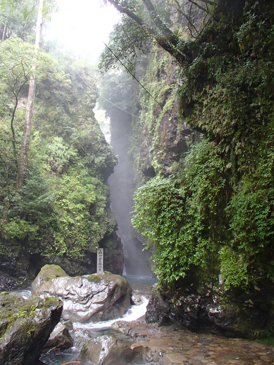 日本の滝百選『轟の滝』は、公称落差58m(実際には35mほどかな?)の直瀑で、滝の前にせり出した大きな岩によって、真正面の位置からは全容が見えません。