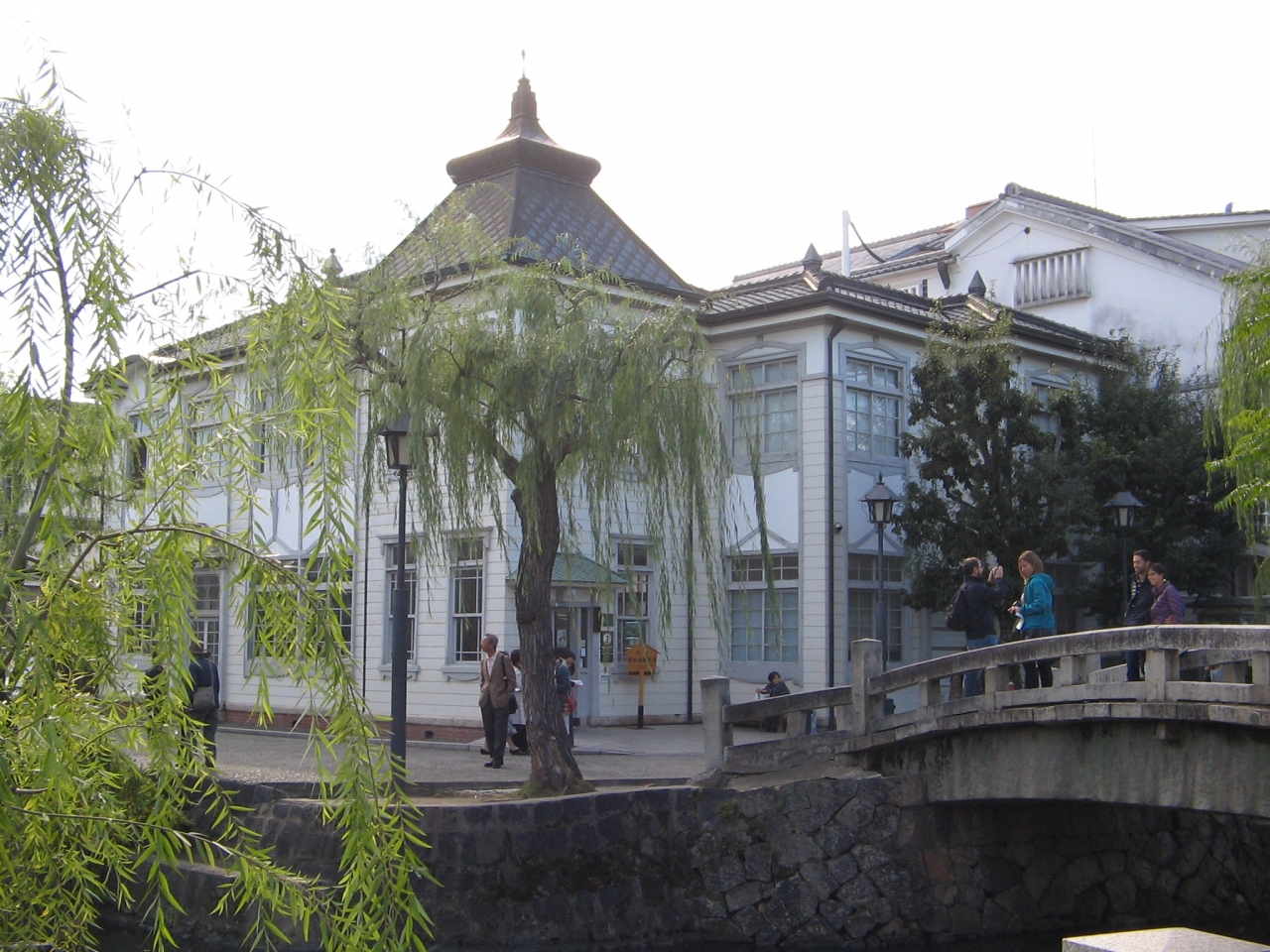 美観地区のちょうど真ん中ほどの所に中橋と言う石橋が掘割にかかっています。その橋の正面で道が少し曲がっている部分に倉敷館があります。