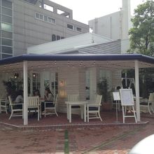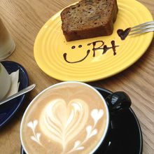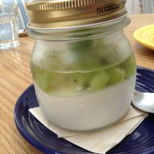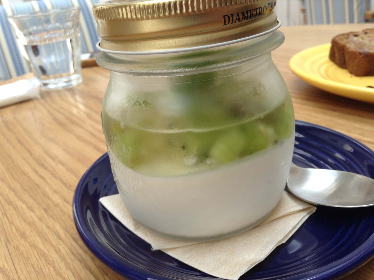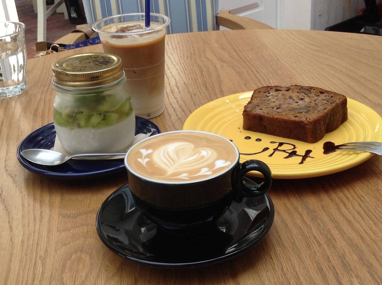 晴れていたのもあり、気持ちのいいオープンカフェで、バナナケーキとカフェラテ、瓶の器に入ったパンナコッタを注文。