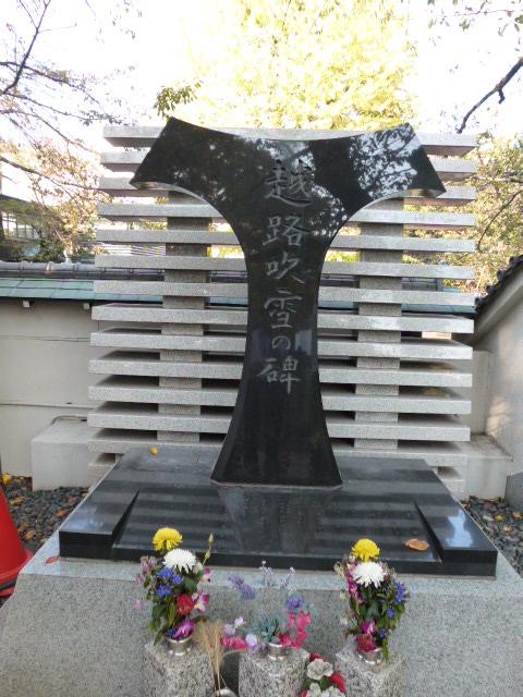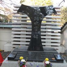 黒くて光沢のある特徴的な形状の記念碑ですが、この時期は、境内の銀杏が色づき始め、大変見ごたえのある景観を呈します。
