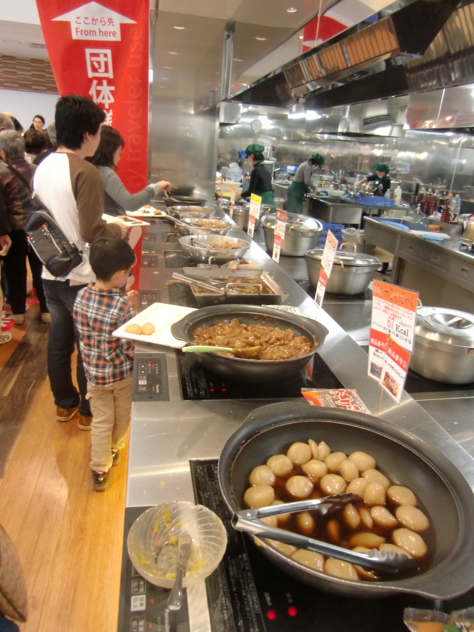 3連休最終日の12時頃に訪問。入口を入ると「こんにゃくバイキング」に並ぶ長蛇の列が・・受付嬢の「2時間待ちです」の言葉にビビリましたが、とりあえず並んでみることに。意外に列がどんどん進み、30分位で「バイキングカウンター」にたどりつきました。いろいろなコンニャクがありましたが、おすすめは「こんにゃくラーメン」と「こんニャクゼリー」かな?いろいろと人手もかかっているので、「いくらかお金をとっても良いのでは」と思いました。2階の「こんにゃく工場」見学も、勉強になりました。