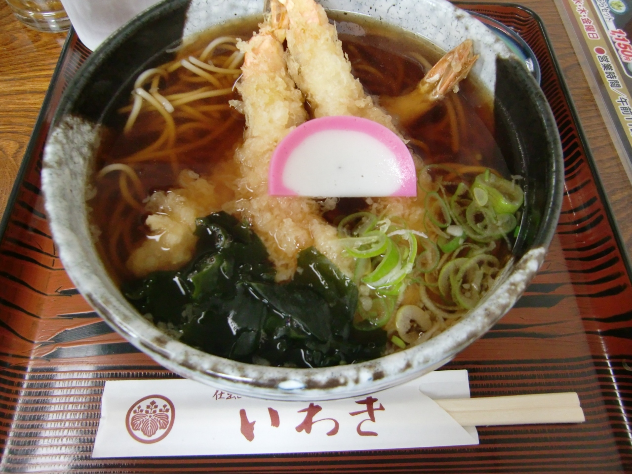 赤字丼より小ぶりなエビ天が3本トッピングされたおそばは