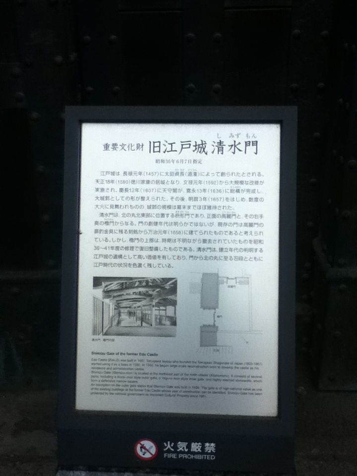 地下鉄九段下駅の南西、千代田区役所の向かいにある清水門橋を歩いていくと、右にある。平日午後だったせいか、田安門に比べ、こちらは通る人がほとんどいなく静かである。こちらの門は、1624年に建設され、また昔このあたりに湧水が出ていて、清水寺があったことからこの名前が付いたと言われている。1863年のの本丸炎上の際には、将軍らがここに移ったとも言われている。特に江戸時代やこの界隈に関心や知識がある方にとっては興味深い施設であり、訪問することをお勧めする。