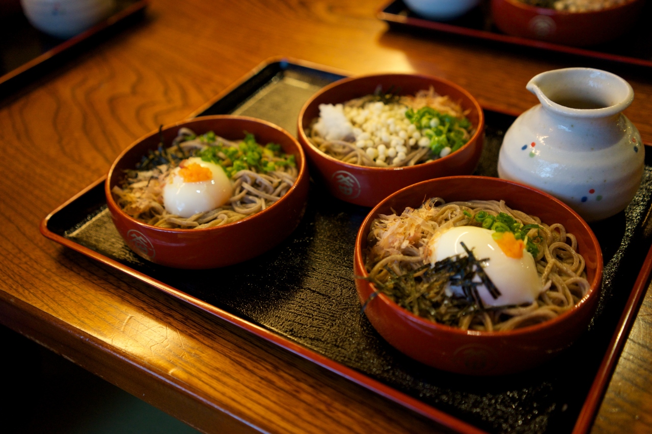 オーダーしたのは三色割子。とろろ、温泉卵、天かすおろしの3種類の味が楽しめます。当方とろろが苦手な旨を伝えたら温泉卵に替えていただきました。