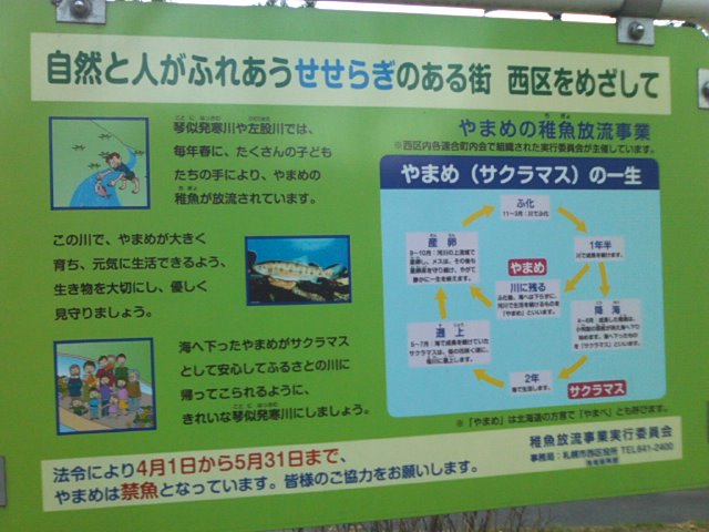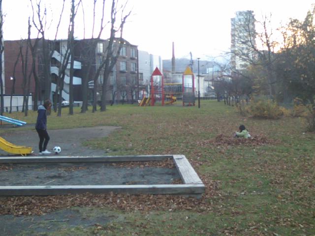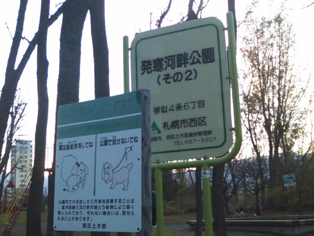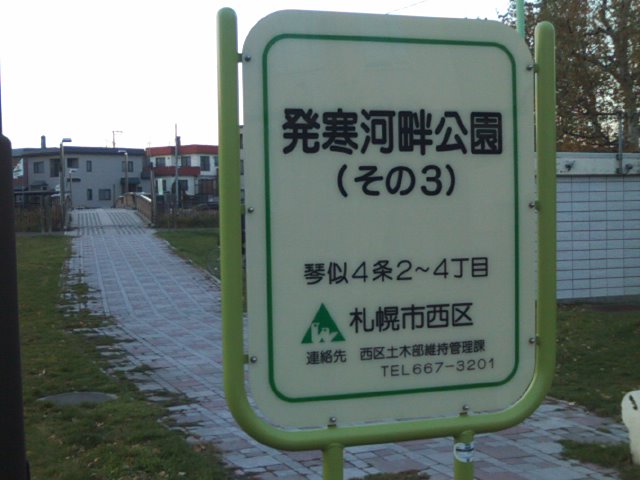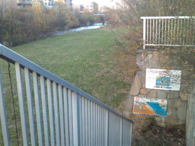 国道五号線沿いの発寒橋から程近い、琴似発寒川沿いにある公園ですが、実はここは複数あるようで、私が歩いた範囲内では、その2とその3と付された河畔公園を見つけましたので、最低3つはある公園です。面白いのは公園自体は河畔から離れた高台に、普通の町中にある公園と同じようなレイアウトで設置されているのですが、河畔というだけあって、随所に川の傍まで降りられる階段が設置されていて、渇水期はその河畔の芝生のような場所で遊べるようにもなっています。勿論、増水するとすぐに浸水してしまうエリアですので、雨降りの後や融雪期などは特に立入りには注意が必要だと思います。琴似発寒川では、ヤマメの放流事業というのが地元の有志の方々の手で継続されていて、札幌の街中で地元の方が普通に釣りを楽しむ姿が見られたりするのも、この公園付近の素敵な風景だと思います。