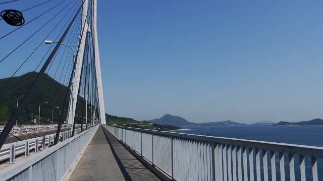 しまなみ海道は愛媛県今治市と広島県尾道市を結ぶ約70?の道。このうち橋の部分には自転車専用道路が整備されておりレンタサイクルで四国から本州(またはその逆)のサイクリングを楽しむことができる。瀬戸内海の島々と海の眺望が見事で、晴れた日には心地よい風を浴びながらのサイクリングが楽しめた。ただまっすぐ進むだけでは4時間もあれば到達してしまう。当日は8時にサンライズ糸山でレンタサイクルを借り、尾道に18時返却のプランを立て周辺の展望地を経由しながら進んだ。注意する点としてはレンタサイクルの受付が混雑しており借りるまでに20分近く待ったこと、島と島を結ぶ橋は上り坂を上がること、ずっと高速道路わきを進むのではなく島内の一般道を進みながらわたりこちらもアップダウンがあることなど。また、向島から尾道市への橋は歩道のない交通量の多い一般道を渡るので危険。今治から尾道市に着いた時の達成感が忘れられない。