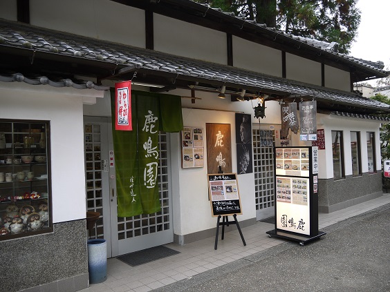 広い東大寺を見学後、二月堂へ向かう途中疲れたので一休みと思った時に鹿鳴園が有りました、そこで葛餅とぜんざいを注文しましたが、何と言っても歩き疲れたときの甘味は最高ですネ。店内に松ぼっくりを利用した「ふくろう」を売ってましたが、土産に松ぼっくりを頂いて来ました。
