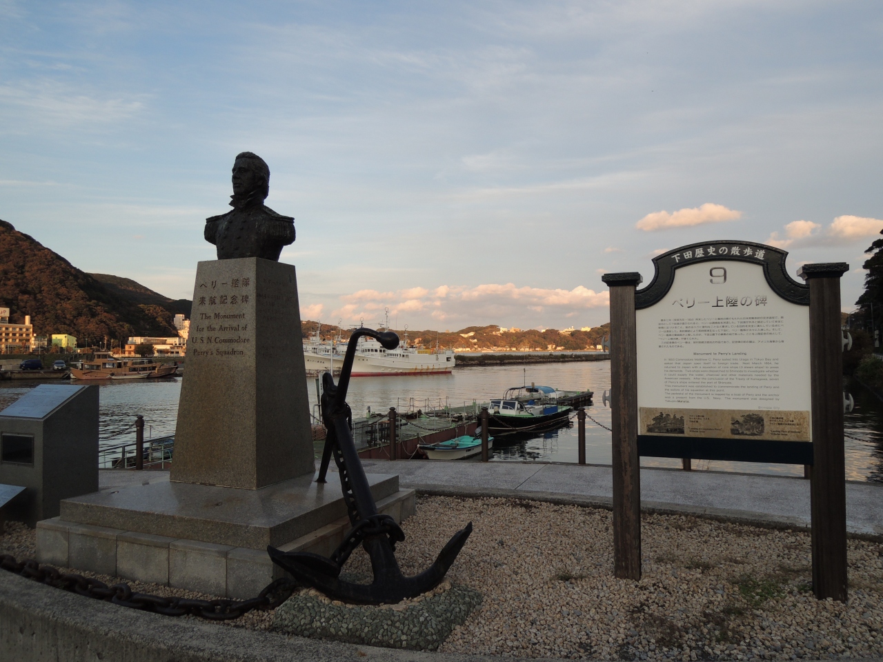 下田公園の下にあるペリー上陸記念碑はあります。ペリーが安全に容易に近づける港を要求したことでここが選ばれたが、入り江にあって向こう側にとっては安全であるのかどうかはよくわからないが、ここに軍艦7隻が入港したというから、当時のその様子を思い浮かべると面白いです。