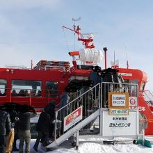 公共交通でのアクセスが難しい紋別の港から出港する流氷観光船。わざわざこれに乗るためにやってきたものの流氷があるかないかはその時の運しだい。当日は天気こそ恵まれたものの流氷は薄いものがかろうじてある程度。ガリンコ号自慢のドリルで流氷を砕いて進む迫力は体験できなかった。