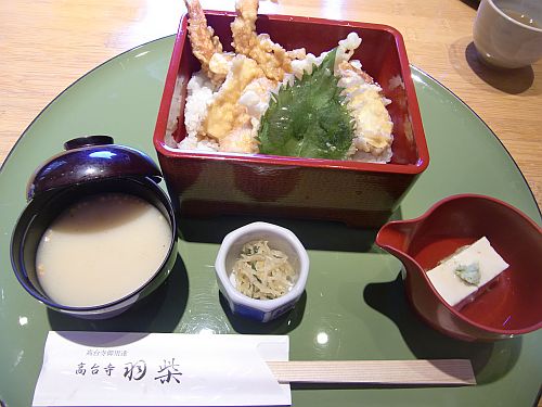 京都の観光地ではランチをするにも結構高いと思います。てんぷら重が手軽でお手頃なので選びました。エビが2匹入っていたのは嬉しい事でしたが、他の具材は普通でした。座席の丸窓から見えた大黒天の横の木々の色づきが青い空に映えてとても綺麗でした。