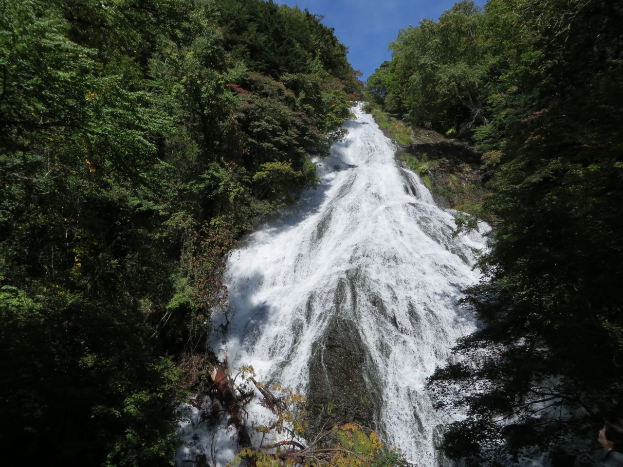 群馬県境にも近い湯の湖から、落差50m、幅25mの急斜面を豪快に落ちる滝です。
