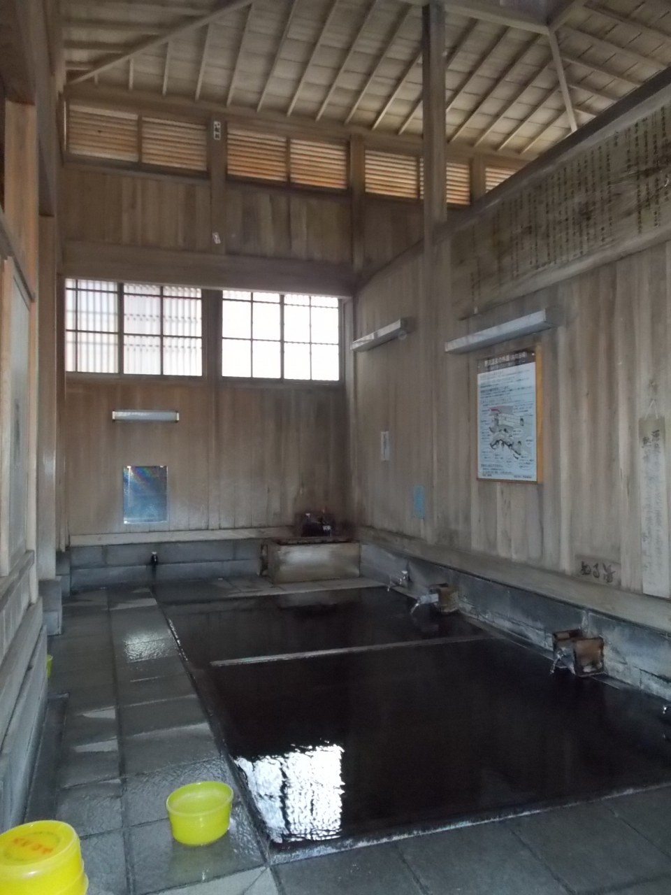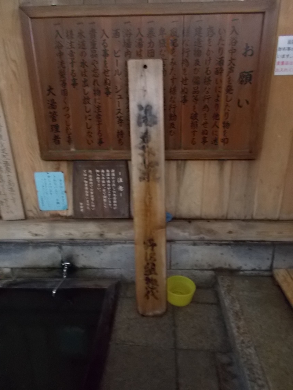 基本的に野沢温泉の泉質は熱いので、入る前に水を少しずつ入れながら板でかきまぜます。硫黄の臭いがしました。
