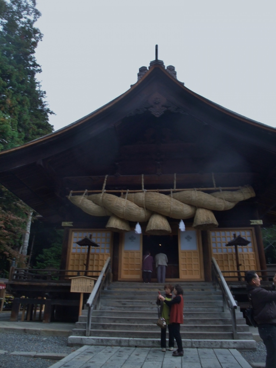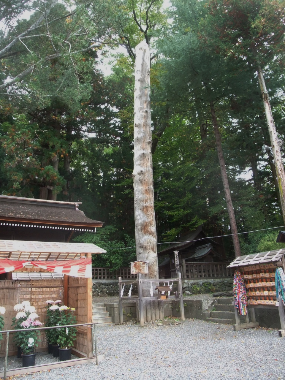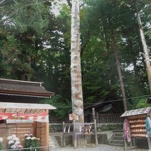 社殿の四隅には御柱と呼ばれる木柱が建てられており、七年に一度、「御柱祭」がおこなわれます。御柱とされるのは樹齢200年程の樅の巨木です。