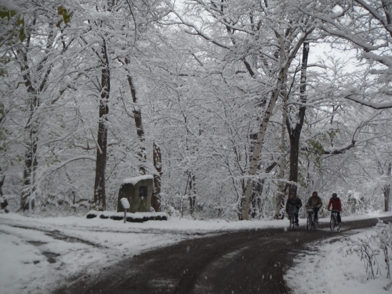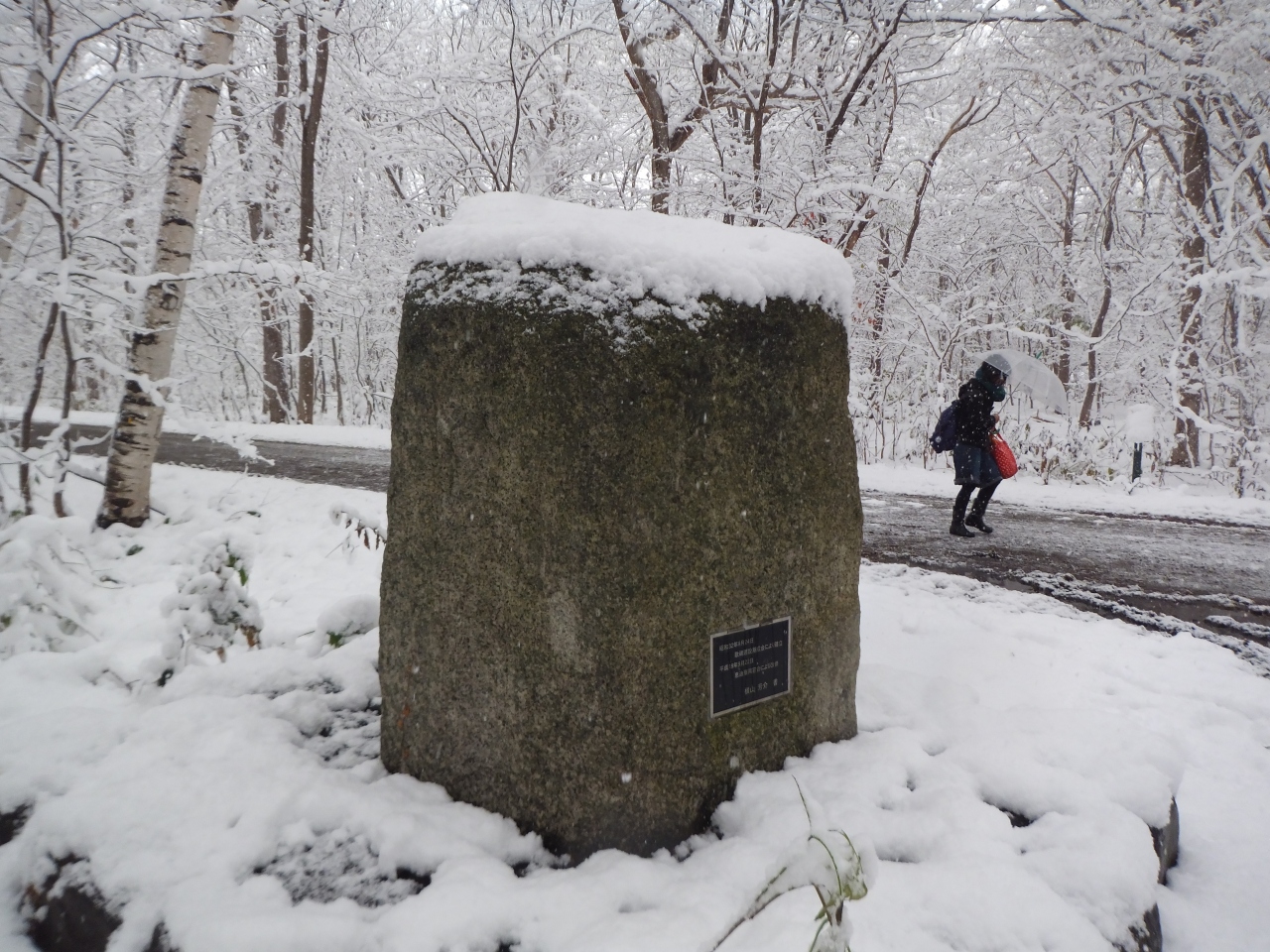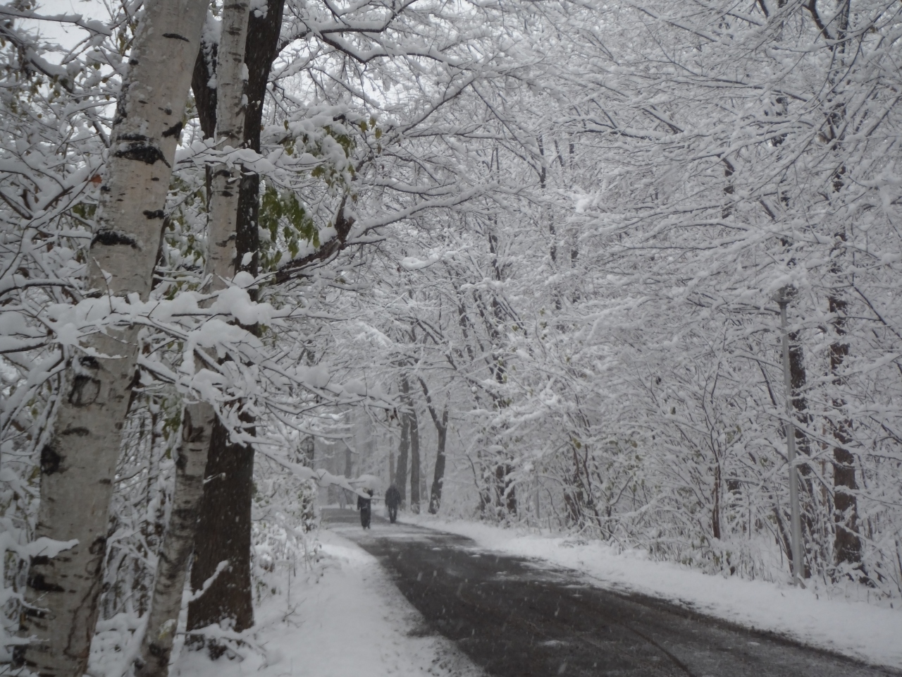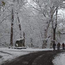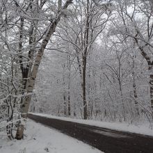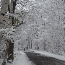 11月の半ば。札幌の街に本格的な雪が降り、紅葉にもえていた森にも冬が到来しました。降り始めの雪は東京の雪と同じで、湿り気があります。そのため、枯れ木の枝に、まるで樹氷のように白い雪がくっついてきれいです。ちょっと寒いですが、一面銀世界となった森の中の小道の散策が楽しめました。