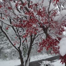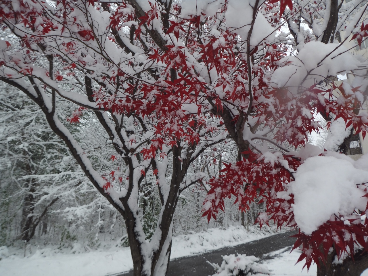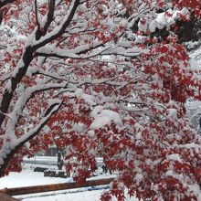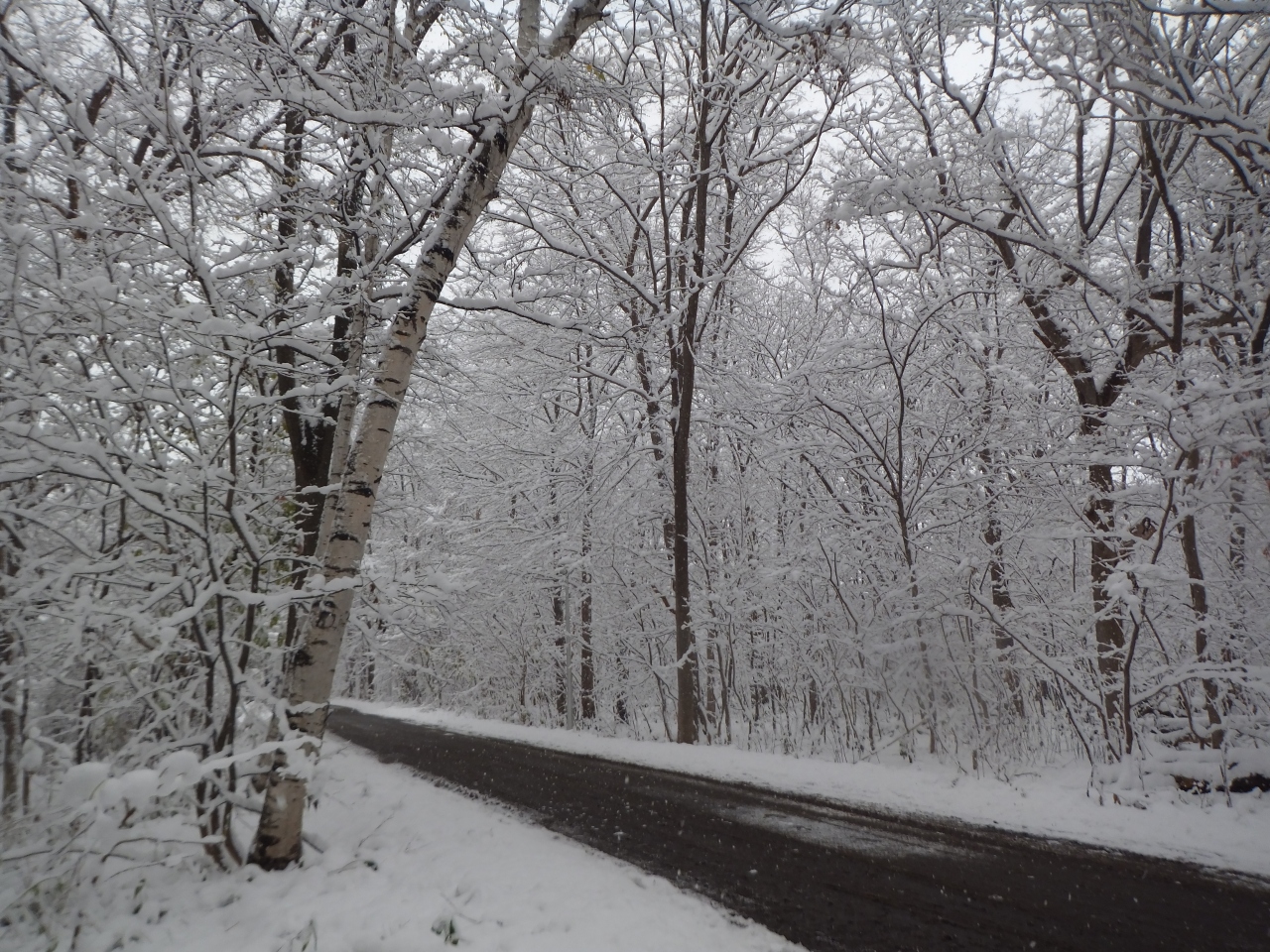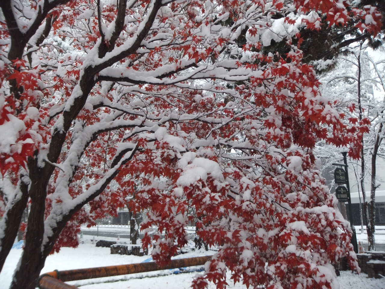 11月の半ば。札幌の街に本格的な雪が降り、紅葉にもえていた森にも冬が到来しました。降り始めの雪は東京の雪と同じで、湿り気があります。そのため、枯れ木の枝に、まるで樹氷のように白い雪がくっついてきれいです。ちょっと寒いですが、一面銀世界となった森の中の小道の散策が楽しめました。