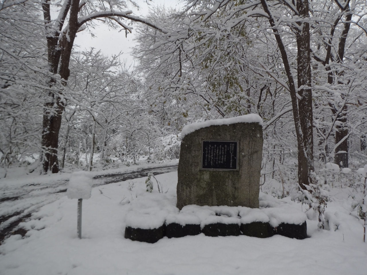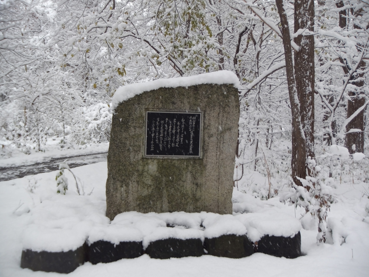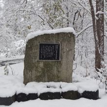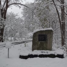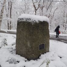 森の中ですが、大学の寮があったようです。1983年にここにあったものは取り壊されたそうです。碑の由来を書いた案内板が横に立っていました。ここに来るまで別の碑があり、近くに別の寮もあったようです。今となっては森です。