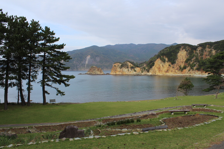 黄金崎一帯は公園となっていて芝生の広場、展望広場などが造られ季節ごとに様々な草花が植栽されるはずですが、植え替えの狭間か花畑には花は咲いていませんでした。タイミングが悪かったのかもしれません。しかし花畑から外れた遊歩道の傍らにはツワブキの花が綺麗に咲いていました。