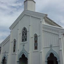 十字架を掲げる尖塔があり、正面から見ると左右対称の作りはヨーロッパの石造りのもののように見えますが、木造の建物です。