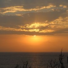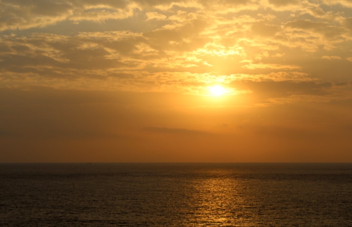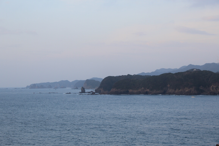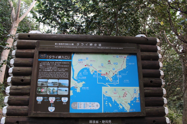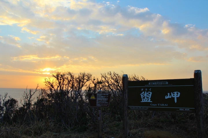 弓ヶ浜の宿から朝食前にタライ岬遊歩道を通り日の出を見に行きました。片道約2Km、写真を撮りながら約1時間半歩きました。逢ヶ浜から先はほとんど人が通らないと思われる山道を歩いてタライ岬に着きました。タライ岬からは下田の先の爪木崎から石廊崎まで南伊豆の海岸線が一望出来ます。天気が良ければ伊豆諸島の島々も望めるようです。日の出もなかなか綺麗でした。