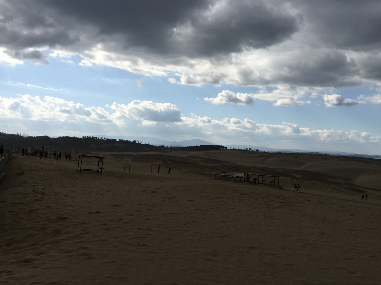 鳥取空港から乗り合いタクシーで15分弱とアクセスは良いです。駐車場からもちょっと階段を上るだけで、例の砂丘の景色が広がります。残念ながら11月は既にシーズン外のようで、淀んだ空が印象的ではありましたが、歩く度に薄っすらと残る足跡は感動的でした。