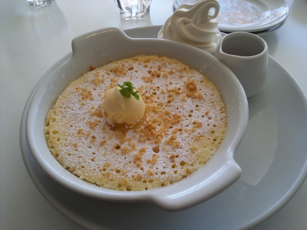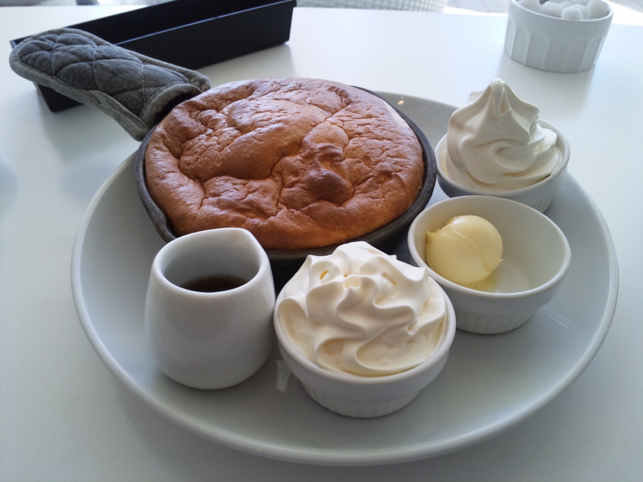 週末だと混んでいそうだったので、土曜日の開店少し前に着くように行きましが、行列がほとんどありませんでした。窓側のカウンター席とテーブル席とテラス席があり、早く行くとカウンター席に優先して通されるようです。プレーンなバターのスチームパンケーキとスフレパンケーキを一皿ずつ注文しました。スチームパンケーキは思ったよりすぐ出てきました。熱々という感じではなく、バターの風味が強いカステラのような食感でした。スフレパンケーキはふわふわで香ばしくてこちらの方がより美味しく感じました。あとパンケーキの付け合わせのアイスクリームがとても美味しくて、パンケーキにつけても単体で食べても◎です。