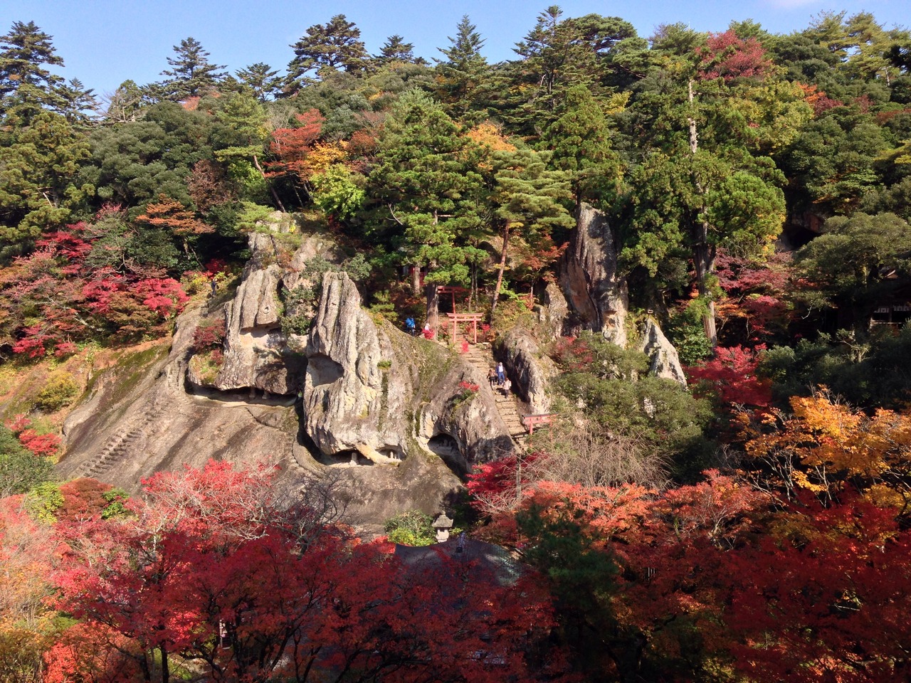 粟津温泉に泊まり、次の朝、宿の車にて那谷寺まで送って貰いました。近くのお土産さん、花山亭に荷物を預けて拝観料を払い、中に入りました。運良く、快晴に恵まれたおかげで、素晴らしい紅葉を心ゆくまで堪能出来ました。見所の箇所が沢山あり、午前中一杯掛かりました。那谷寺名物の胡麻豆腐をお土産に購入、お昼は荷物を預けていた花山亭で、小松うどんを頂きました。紅葉を楽しむなら、今がまさにベストシーズンです。