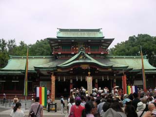 深川不動堂からお祭りの出店が続く道を進むと富岡八幡宮で、横の階段から拝殿に向かうとお参りする人の行列が出来ています。境内には深川八幡祭り各町神輿連合渡御に合わせて御神輿があり、巨大力士の碑や伊能忠敬の銅像などがあります。
