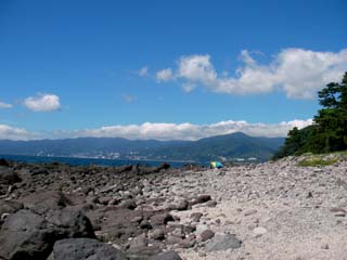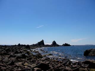 大きな丸石が並ぶ海岸線を、石の上を飛び跳ねて進むとカーブして見る方向が変わって、岩が三つに分かれて見えるようになりましたが、三ッ石まで半分ぐらいまで来たところで暑さのため引き返しました。