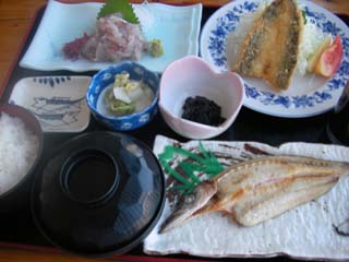 地魚刺身定食は、足が早いので流通しないソウダガツオの刺身があり漁港の近くならではで、カマス三昧定食は、焼き魚とタタキとフライのセットでソースがついていきて、シジミの味噌汁と一緒にいただきました。