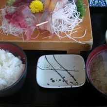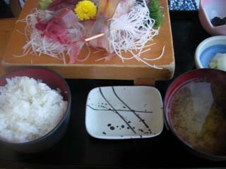 その日に採れた魚を使うためメニューは手書と写真シートで毎日変わるようで、金目鯛の煮付けが名物のようですが、この日はなくカマス三昧定食(1,650円)と地魚刺身定食(1,800円)にしてみます。窓からは入江になった港が見えて、ちょうど入港する漁船が眺めていると、地魚刺身定食とカマス三昧定食がやってきました。