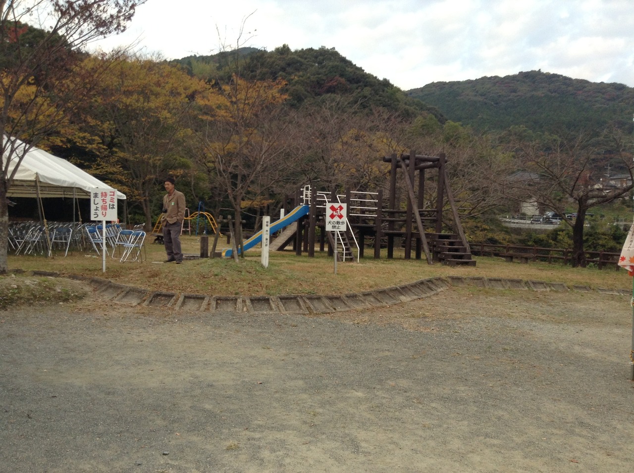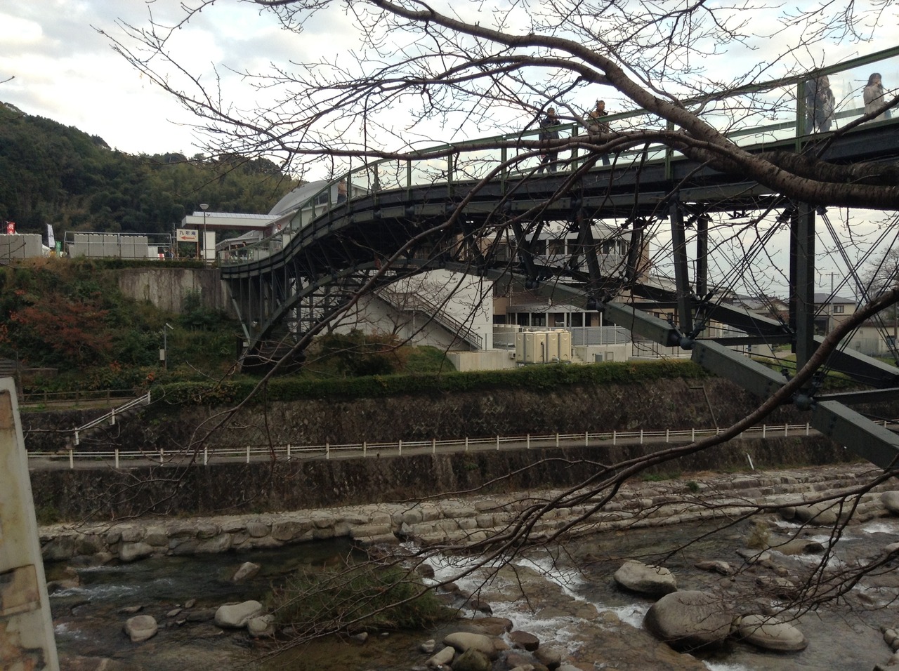 公園から川を渡った所に温泉施設もみじの湯があり、そこにかかる木製の橋が木造トラス構造という珍しい工法らしく、湾曲した面白い橋でした。また、橋からは見晴らしが良く、吉野ヶ里方面が見渡せます。九年庵のバス発着場になっているので、ついでに立ち寄ることになりますが、わざわざ行く所ではないです。