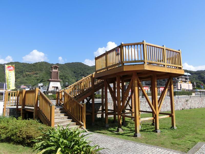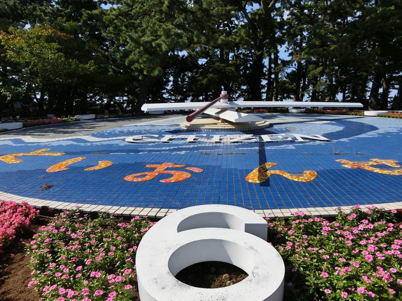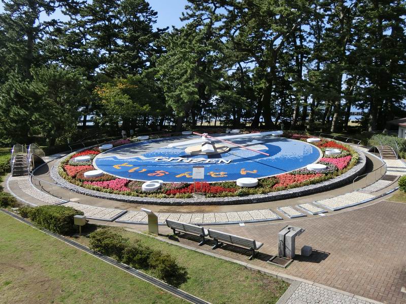 松原公園にあるギネスにも載ったという花時計です。花時計といっても花が植わっているのは文字盤の周りのみで、意外と花が少ないなという感想ですね。花時計の周りは足ツボのコースになっています。ほぼ平面にあるので肝心な時刻が分かりづらいです。花時計を見るための展望台があるのですが、高さが中途半端な気がしました。道路を挟んで足湯があり、海岸もすぐそばなので、まとめて訪れると良いと思います。