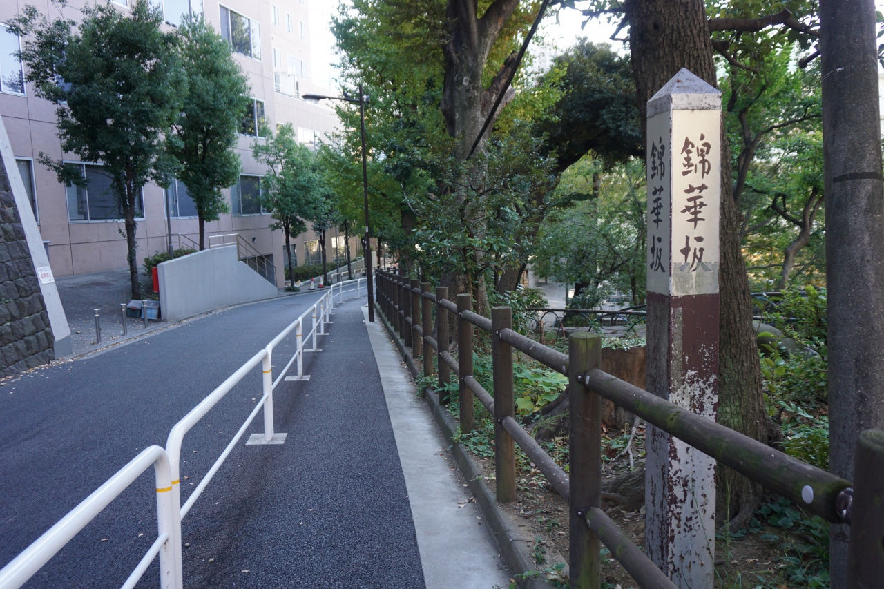 錦華坂は、とちの木通りから少し下って行った場所。男坂や女坂と同じ方向に下っていますが、こちらの方は比較的緩やかです。名前の由来は、坂の下に錦華小学校があったことからのようですが、今は錦華公園沿いに下っているし、錦華はこの地域全体の名前でしょう。公園はけっこう殺風景だし、坂の往来も人影がまばらです。
