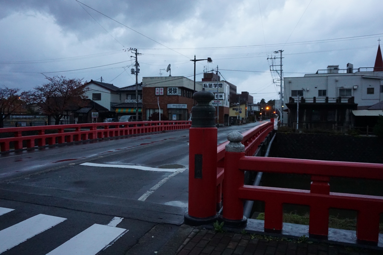 鶴岡のしっとりした風情を楽しみたいのなら、藤沢周平の小説に登場する五間川のモデルとなった内川周辺がお勧め。そして、その景色にワンポイント、華を添えるのが朱ぬりの橋の三雪橋です。この橋から見る鳥海山、月山、金峰山の3つの山の雪が、とても美しかったことから、県令、三島通庸が名付けたのだとか。三島通庸は、やや強引にあちこちで公共工事を進めたことから、山形ではあまり評判はよくないのですが、これはいい名前を付けたものです。たもとに、田沢稲舟の胸像もあります。