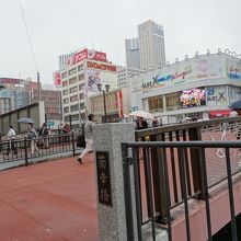 絶えず人がたくさん通る橋です横浜側から来るとこの橋の先に家電量販店や